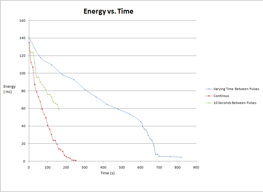 Notice that as the amount of time between the H.V. states 0 and 26kV increases, the rate of energy loss decreases. The blue line (Varying pulses) indicates when there were 1 minute intervals between 0 and 26kV states. The line shows that the energy decrease is dominated by the number of pulses instead of how long it spends in the gas processor. Also notice, between the 600-700s mark of the same blue line a sharp drop in beam energy. This is when the interval between 0 and 26kV was changed from one minute to 10 seconds; reinforcing the idea of pulse dependency. The other two lines (red=H.V. set to 26kV continuously, green=H.V. changed from 0 to 26kV every ten seconds) drop at a very similar rate being that their total number of pulses are similar.